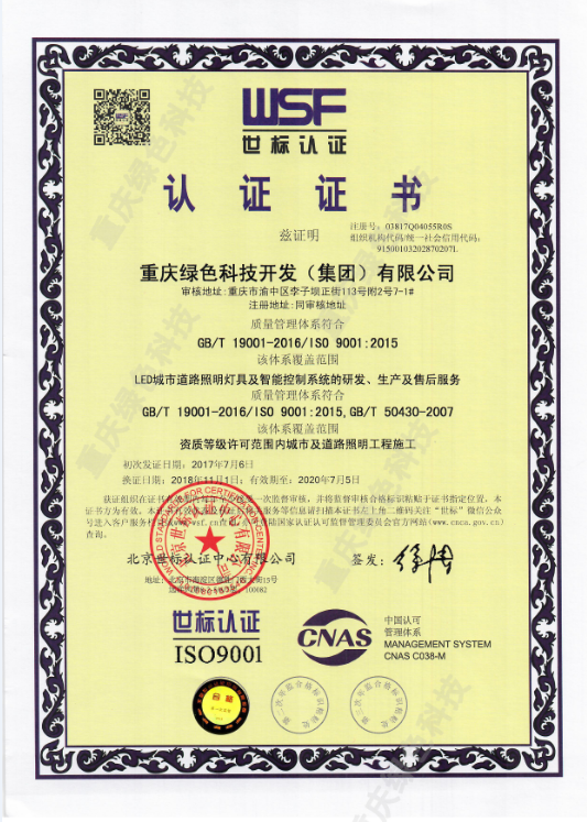 重慶綠色科技開發(集團)有限公司是國家高新技術企業、重慶市LED智能控制技術工程研究中心、重慶市中小企業技術研發中心、重慶市高成長性科技企業。擁有一支專業的多色溫LED智慧照明科研團隊,獲得國家發明等各類自主知識產權專利100余項。公司是以物聯網全光譜多色溫LED智慧路燈及“智慧城市”城市照明夜景燈飾聯動三級管理共享平臺為主要研發方向的現代科技型企業,經營銷售物聯網全光譜多色溫LED智慧路燈系列照明產品和教室照明護眼燈,推廣合同能源管理(EMC)照明節能改造項目、節能減排技術以及節能項目設計、融資、改造,咨詢服務、銷售、工程實施和技術推廣。